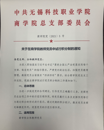 为深入贯彻落实习近平总书记“要把全面从严治党落实到每个支部、每名党员”的指示要求,严肃党内政治生活,加强党员教育管理,激励党员全面落实“四讲四有”要求,近期商学院党总支在党员中全面推行积分制管理工作。
