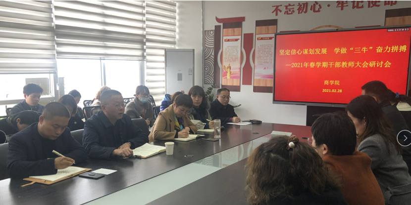 为贯彻落实2021年春学期干部教师大会精神,为“十四五”规划开好局,为新学期起好步,2月28日上午,商学院召开学习讨论会,进一步统一思想,提高认识,群策群力谋划学校发展和新学期工作。学校副校长华裕良、商学院班子成员及全体教职工参加了此次会议,会议由商学院党总支书记汤兴荷主持。