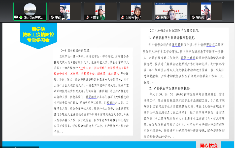 教师代表就近期防控工作做交流发言。徐颖老师带队在南京参加技能竞赛集训,表示面对突如其来的疫情积极配合地方管控要求,做好学生防控物资的采买和心理调适工作,目前一切进展顺利;曲璞玉老师作为住校辅导员,自己严格执行学校防控要求的同时,每天走访宿舍,和学生谈心交流,积极做好学生管理工作;班主任代表肖陆嘉、周晔老师交流了学生日常管理的心得体会,要做学生的贴心人,实时关心,重点关注;学生工作戴媛媛老师提出近阶段在加强常规管理的同时要注意言论的合理引导,营造积极向上的氛围;居家老师朱琰表示积极配合社区防疫要求,做好健康监测工作,同时保证学校工作不落下。