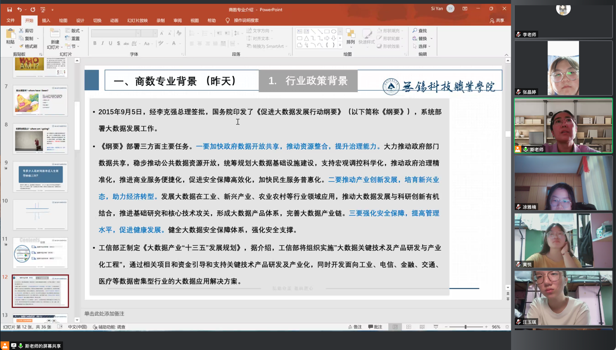 跨境电子商务专业负责人马力老师从跨境电子商务后疫情时代的大环境入手,在全国共有上百个跨境电商综试区,跨境电商的政策利好的前提下,告诉学生要稳抓本专业的发展契机,利用好无锡“两核、五圈、多园”的整体布局和得天独厚的发展前景,稳步提高自己的整体能力。