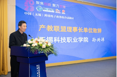 校长孙兴洋在致辞中提到,今年产教联盟继续凝聚政府、行业协会、院校和企业资源优势,先后组织召开了中国(无锡)跨境电商综试区人才培养产教联盟工作研讨会、2023年无锡跨境电商人才双选对接会和第八届跨境电商创新创业大赛,并承担了长三角跨境电商交易会的志愿者服务,深度服务无锡市跨境电子商务产业。同时,组织在锡院校参加Shopee杯跨境电商创新创业大赛获华东赛区一等奖4项,三等奖2项,参加第五届全国电子商务师职业技能竞赛全国选拔赛三等奖1项,通过以赛促学,以赛促教,以赛促融,为无锡跨境电子商务学子的学习和工作积累了知识与经验。
