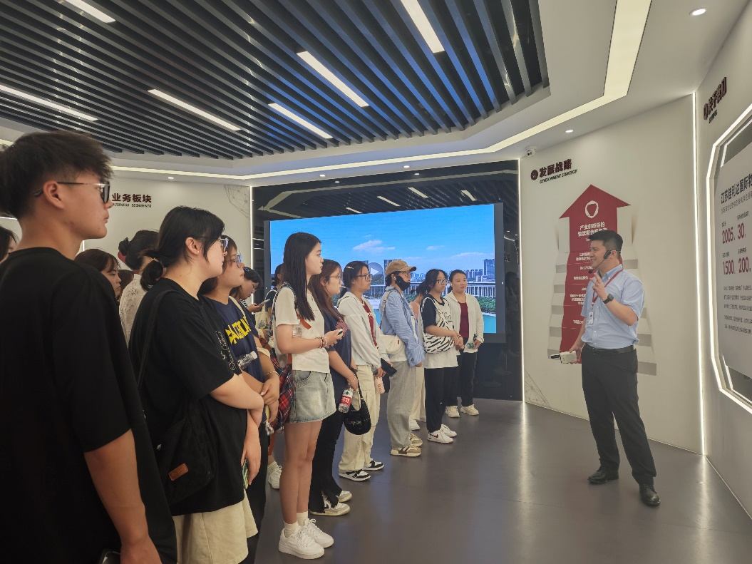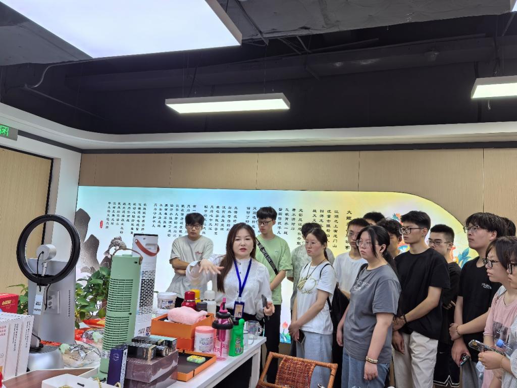 接着,同学们走进了无锡大鲤鱼文化科技发展有限公司,真实地感受了企业的工作氛围,大鲤鱼文化科技是一家以直播产业赋能为核心的综合型科技企业,拥有多平台MCN授权和丰富的网红达人资源,通过大数据可视化平台全方位地实现直播流程的系统化。公司负责人赵慧敏女士热情细致地给学生们讲解了公司是江苏直播电商产业创业服务基地,在3500平方米的工作场地内,同学们领略了供应链展厅、功能齐全风格各异的25个专业直播间和AI数字人展示运营中心。通过赵总对AI等新技术的生动介绍,同学们一边参观一边感叹着科技改变生活的巨大变化。