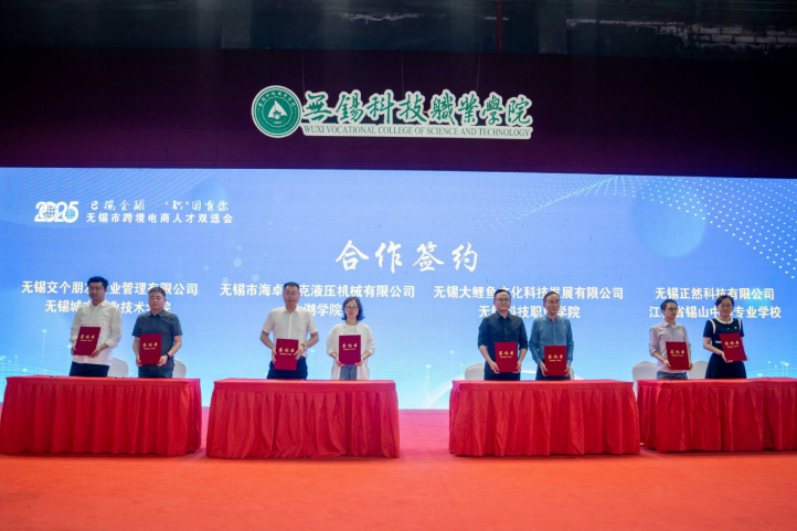 活动现场,太湖学院、无锡科技职业学院等 4 所院校分别与无锡市海卓力克液压机械有限公司等企业签署深度合作项目,通过订单班、学徒制等模式共育跨境电商人才。